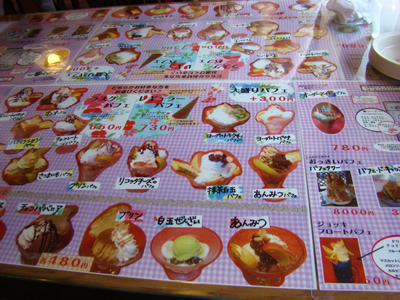 テーブル下に敷いてあるメニューは一面パフェ。